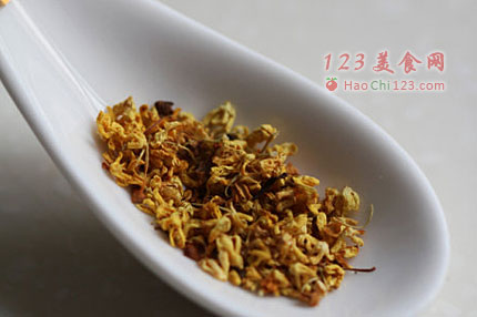 7、再把融化的藕粉倒入锅中,边煮边搅拌,待汤粘稠后即可关火,洒入桂花。