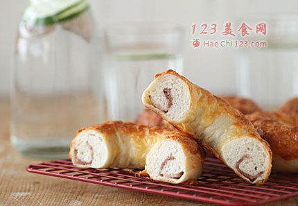 5、将未卷到培根的一头用擀成杖头压扁(图3),将另一头放在其上(图4)后包起来,捏紧封口处(图5)。