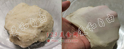 1、做贝果最大的难关要算揉面了,面团揉不到位直接影响整形和成品的美观,要能够顺利整形就要保证揉面到位,可是液体量少,机器打面尚且费力,何况手揉。那加水可不可以呢?水加多了面团固然好揉,可是贝果特有的口感就难保证了。要在短时间里揉面到位,秘诀就是“自解法”,先将面粉和水混匀揉成团,面团会很干硬,但是放置1小时以上就会有神奇的变化——面团可以拉出很薄、很结实的膜。如果不愿干等,将面团揉匀后冷藏过夜也是可以的。我们此次的巡回活动用了3家课堂不同的机器打面,有的是家用厨师机,有的是商用搅拌机,不管用什么机,自解法都是非常有效的保证短时间将面团打到位的方法。