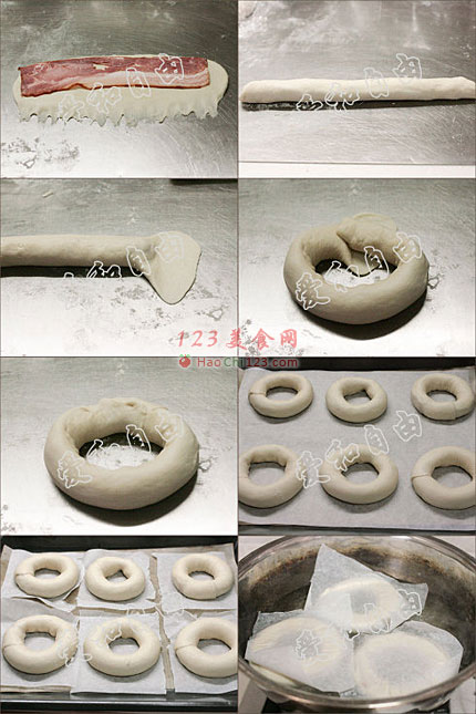 3、我之前做贝果时,最后发酵是放在布上的,便于发好后拿起来。有的朋友问家里没有合适的布如何操作?可以象过程图中的样子,将面团放在烘焙纸上,发好后将纸剪开,把面包和纸一起放在锅中,入水后纸会很容易拿掉。[sushi.laoyanhuo.com]