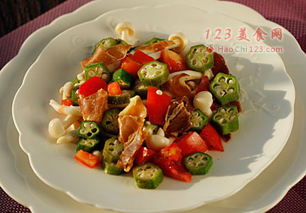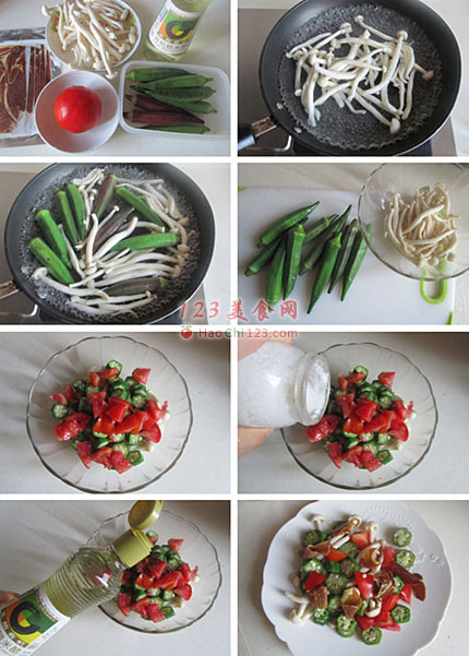 5、将海鲜菇、秋葵和西红柿粒放入大碗中。