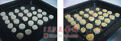 6、切成小块,上面刷蛋黄放入烤盘。175度中层20分钟左右上色(再关烤箱后10分钟取出,这样会比较酥脆)。