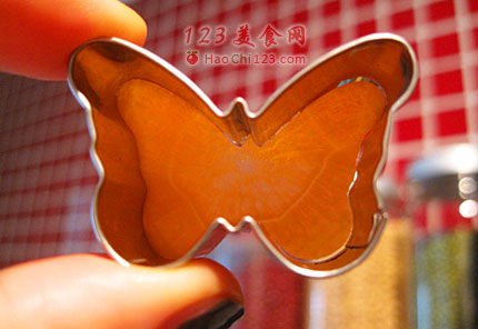 3、胡萝卜用模具切出想要的花型,焯水三分钟。