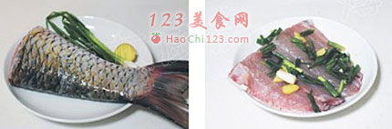 1、草鱼洗净切片,用盐、料酒腌半小时,洒上葱姜。