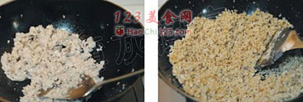 5、不停的翻炒以防粘锅,将水分完全炒干,炒至金黄即可。