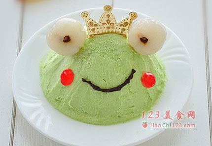 11、想要造型的做好后就放入冰箱冻硬,取出来在盘子里造型就可以了,最后放上荔枝,巧克力挤上嘴巴,草莓酱做红脸蛋。
