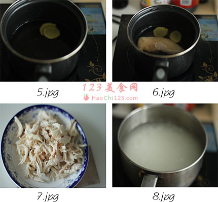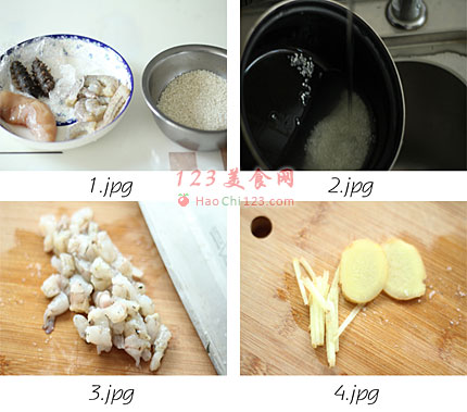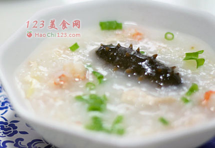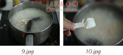 9、熬到粥离自己满意程度6成的时候,放入海参,鸡丝,虾肉,熬至粥软烂粘稠。