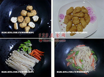 3、起油锅,分别放入金针菇、胡萝卜和大葱。