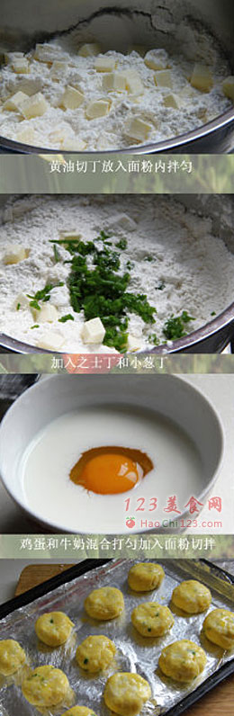 2、加入之士丁和葱拌匀。
