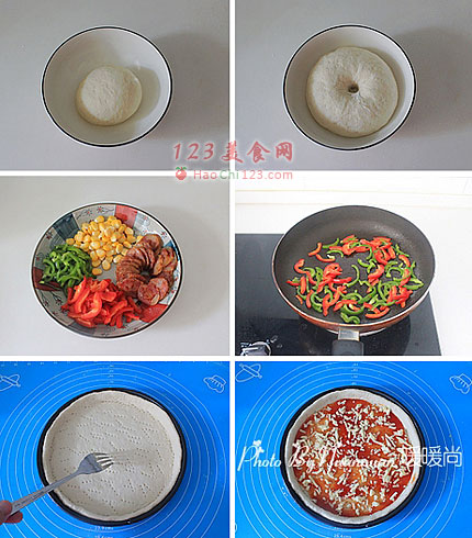 5、将发酵好的面团揉匀后擀成饼,披萨盘提起啊擦一点油防粘,将擀好的披萨饼放进模具,用叉子在面饼上戳些洞防止烤的过程中面饼起鼓。