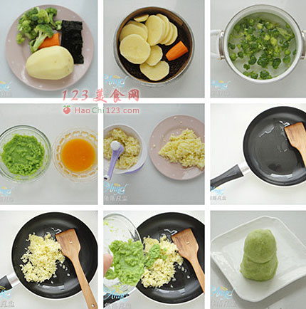 贴士:土豆泥不能用料理机或料理棒打,那样会使土豆泥很软捏不成型,没有料理棒直接用筛子过一下就可以了,西兰花和胡萝卜如果因为量少机器打不到,可以加少许水,但是不能太多以免影响效果。[sushi.laoyanhuo.com]