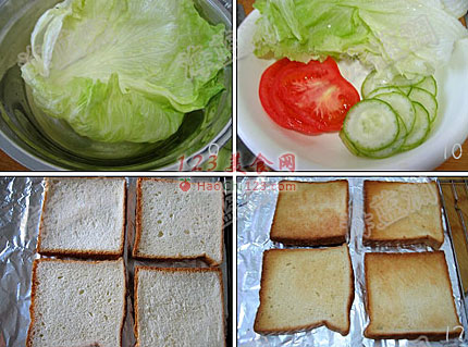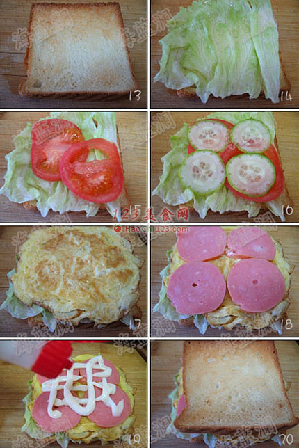 7、13-20图,第一步:将准备好的材料,以下列顺序依次罗放:吐司--->生菜--->柿子片--->黄瓜片--->蛋饼--->火腿--->美奶兹--->吐司。