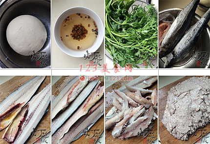 7、所有的鱼肉取好以后,把花肉切成小丁,生姜剁成碎末,和鱼肉混合在一起,剁细,中间分次添加花椒水。