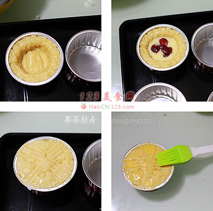 3、再将月饼皮面糊挤在乳酪糊表面,用小刀轻拉将表面尽量抹平整,并用叉子叉出花纹。