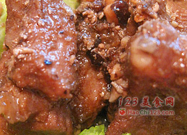 6、小火烹调四十分钟,中间可尝试咸淡味道,基本脱骨后,盛入装有包菜的盘子,撒入剩余榛子碎。