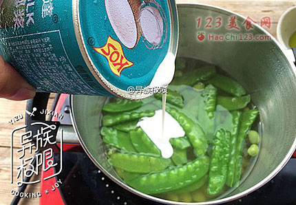 5、几分钟后放入荷兰豆和椰汁,煮至有淡淡的荷兰豆清香味飘出即可离火。