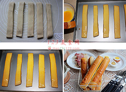 7、在发酵的面包条上刷全蛋液,并用牙签或三角刮板刮出纹路。
