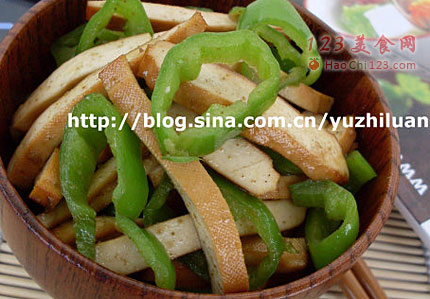 3、锅里放油烧热,放入葱姜丝炝锅,出香味以后放入尖椒和豆干煸炒均匀。