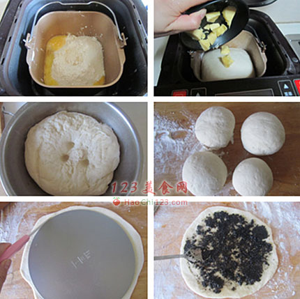 1、采用后油法面包机和好面团后放入冰箱中低温发酵至2.5倍大,拿出来排气、整形,饧上15分钟。
