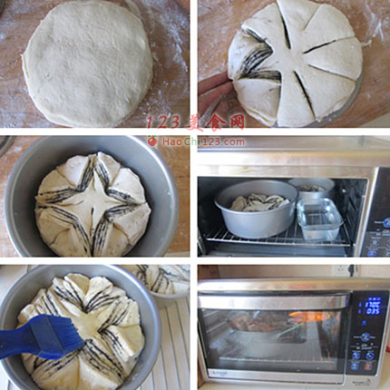 13、30分钟后香喷喷的“芝麻酱花样全麦包”就出炉了。