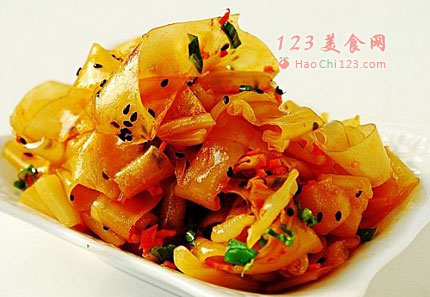 4、切成自己的喜欢的条,放自己喜欢的调料,一碗特别的面皮,成就一个吃货的食欲。