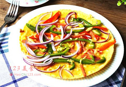 4、简易披萨蛋饼,从食材来看,有芝士,有鸡蛋,有蔬菜,挺丰富的,从口感来看,我觉得更会中式早餐,有点像鸡蛋饼的味道,反正做法简单,十分钟内可以全部搞定上桌吃。颜色也是十分讨喜呀![sushi.laoyanhuo.com]