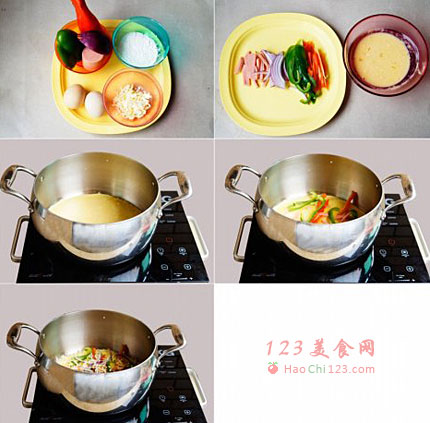 2、鸡蛋打散加入面粉拌匀,火煺切成小条,青红椒,泮葱切成丝。