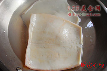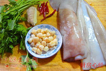 4、鱿鱼要整片凉水入锅,不要切成丝以后焯水,那样鱿鱼容易变老嚼不动。只要锅内的水温达到60度,即可关火。