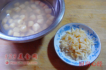 2、干贝提前用凉水泡1-2小时,然后放入容器中,加入开水,蒸1小时。自然凉透以后,将干贝搓成丝备用。