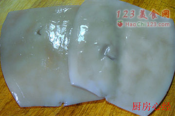 3、将鱿鱼撕去表皮,改刀成整齐的方块状。