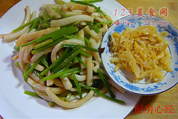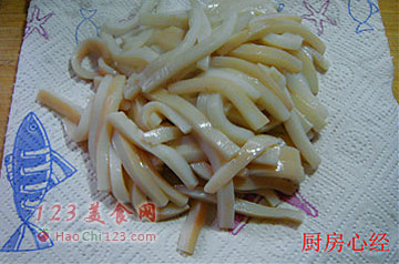 5、鱿鱼冷却后切成丝,用纸巾擦干水分。