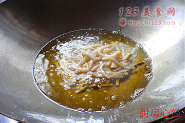 6、锅中放宽油,大约3-4成热,即可下入鱿鱼丝进行冲炸,这样做的目的第一是去腥,第二容易炸断鱿鱼的筋膜,便于好嚼。
