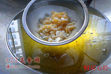 7、将干贝丝放入一个小漏勺中,用3-4成的油温,冲炸成金黄色即可捞出。