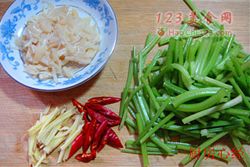 9、另起锅放油,爆香姜丝、干辣椒、芹菜段。倒入鱿鱼丝。