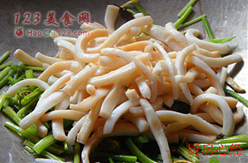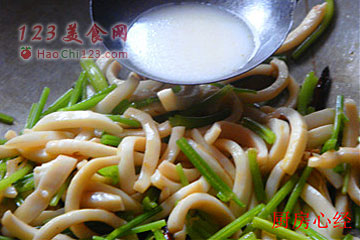 10、将鱿鱼丝翻炒均匀,调入盐、料酒、胡椒粉,水淀粉勾芡。