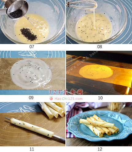 11、趁热卷起成筒状,稍压一会儿定型即可。每次烤1-2,多了会来不及卷起就已经冷却变脆的。