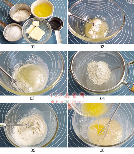 6、将融化的黄油分次加入到面粉糊中,每次拌匀后再加下一次的。