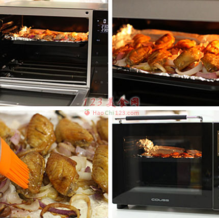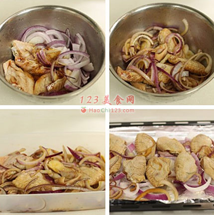 4、烤盘上放入新切的洋葱和原来腌制鸡翅的部分洋葱,排入鸡翅,同时预热烤箱“烤肉”模式,如果没有这样模式可以选择的话,可以选择上下火230度。