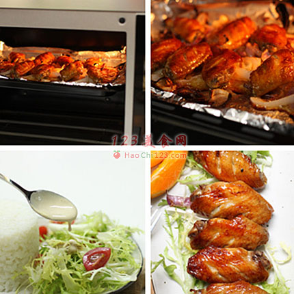 8、装好米饭,摆入蔬菜、橙子,鸡翅入盘,蔬菜上淋上沙律酱汁,即可享用。