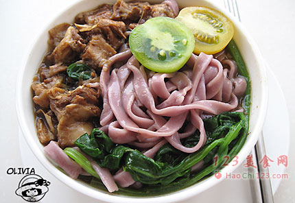 13、捞一勺牛肉、几根菠菜和双色小番茄放入碗中,再浇一大勺牛肉汤即可。