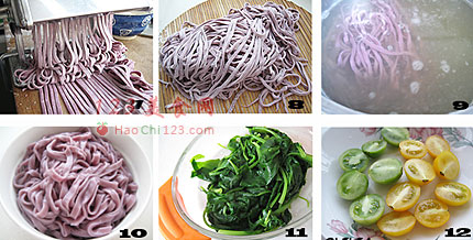9、锅中加入适量冷水,水开后,把紫薯面放入锅中,大火煮开,中间可添加冷水,面条煮软即可。