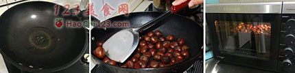 2、板栗盛出,锅里的水倒掉,然后开火放入板栗开始翻炒,炒至表面的水都干了。