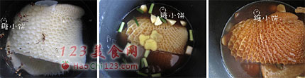 5、再冲洗干净后焯水,焯水后加老卤水和葱姜蒜。