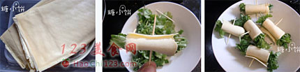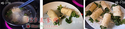 3、用牙签在收口处固定,依次卷好。
