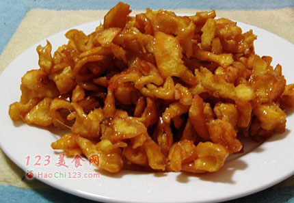 4、锅内倒油,待油温烧到七八成热时,下入拌好的柚子条,炸成金黄色捞出。