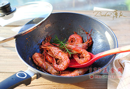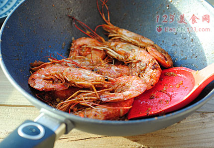 5、放入开好背的虾。翻炒2、3分钟至虾变色,如果酱汁太干可以加少许热水一起翻炒一会。