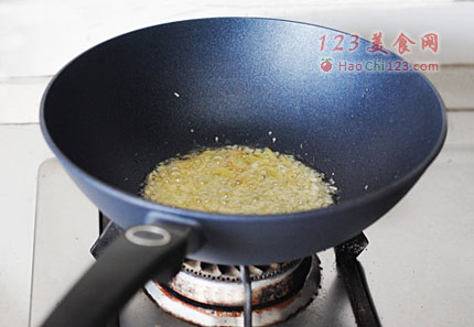 3、炒锅倒油烧至6分热,放入蒜末和姜末小火炒至微黄出香味。