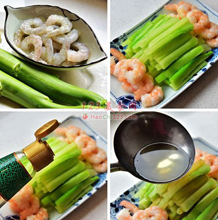 2、锅内烧水,水开后分别把芥兰、虾仁过水焯熟。