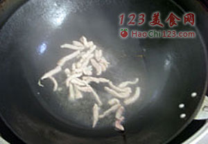 1、起油锅,放入肉丝煸炒。
