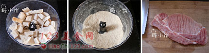 7、在抹好蛋液的肉片表面裹一层面包屑。